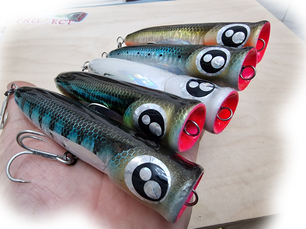 Walk-in-Pop 100 mm 25 grammi popper per la pesca al pesce serra, spigole, leccia amia. Interamente in legno intagliato a mano e tornito, dotato di acciaio inox 1.0 mm, ancorette N°2 di serie, sviwel centrale e sistema clanking integrato